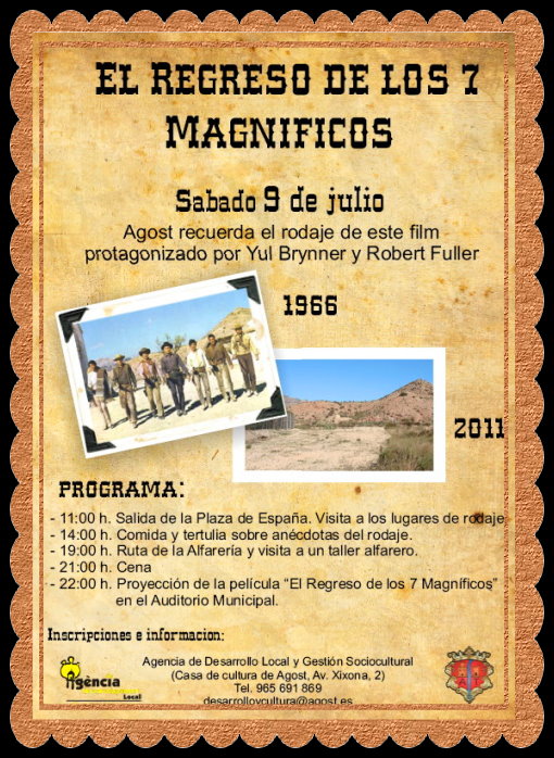 | In Agost (Alicante) an Event was organized to celebrate the 45th Anniversary of the filming of "Return of the Seven", 2011. I was invited, but unfortunately could not fly to Spain for that special day. Anyway, I'm happy that my location informations, material and photos helped so much. Many magazines,... etc have contacted me to get more information. The representatives of "Ciudad de la Luz" were there and had printed out the whole of my "Return of the Seven" page to distribute among the participants! |