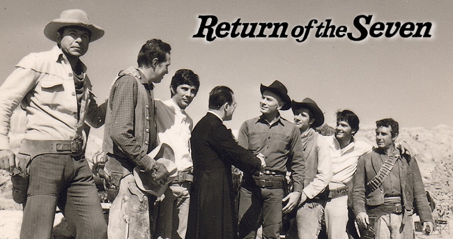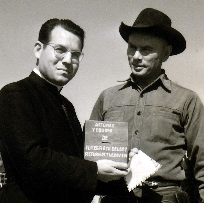 | The Padre holds a small box in his hand with a slot for donations? Actores y Equipo - El Regreso de los 7 - Return of the Seven. |