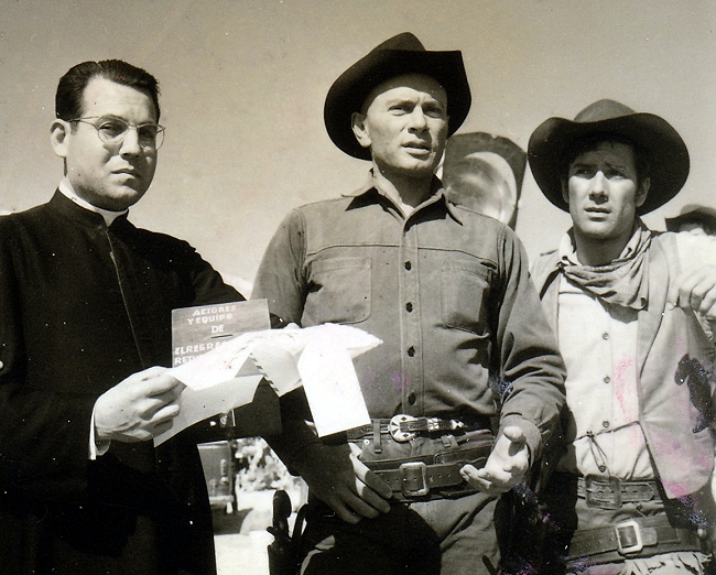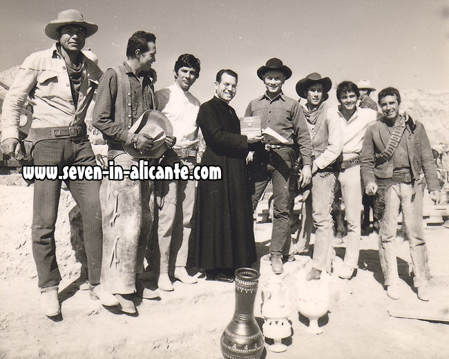 | The "Return of the Seven" Crew donated a lot of money for different purposes. Much money has been donated, for example, for the establishment of a school in Agost. El Colegio La Milagrosa (www.colegiolamilagrosa.es). Between the mountains of photographs from the collection of Antonio Luengo I found some with a Padre who apparently collects donations on Set in Agost. This might be Sr.Párroco Don Pedro López Rosa. |