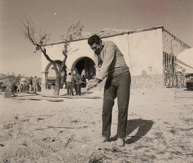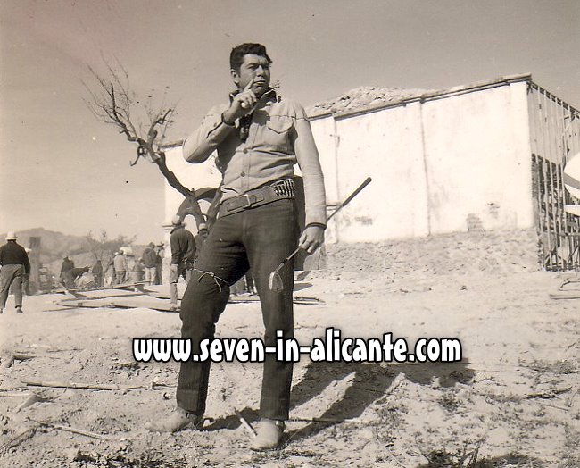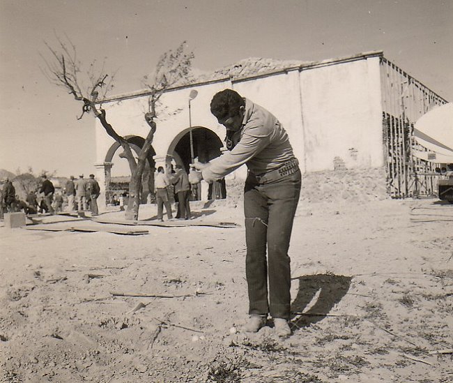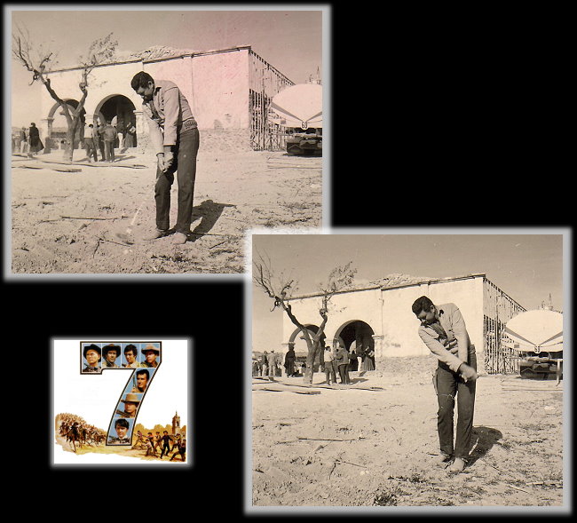 | Actors love to play. Some play Chess, others like to poker. The "Return of the Seven" Stars really shoot the bird with their crazy activities on the Set in Agost. They built a "Wheel of Fortune" out of a wagon wheel of a coach and played other unsual games on the movie Set. Claude Akins was an avid Golfer and this crazy guy really swung his driver in the middle of the movie set in Agost! |